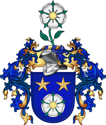 In Rot goldener Rechtsschrägbalken mit drei fünfstrahligen,